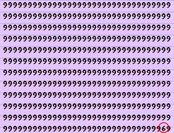 If you haven’t found the 6 yet, here is the solution. In the middle of the image, slightly to the right and a bit down, the number 6 is hidden among the 9s. It really takes a sharp eye to spot it within 6 seconds!