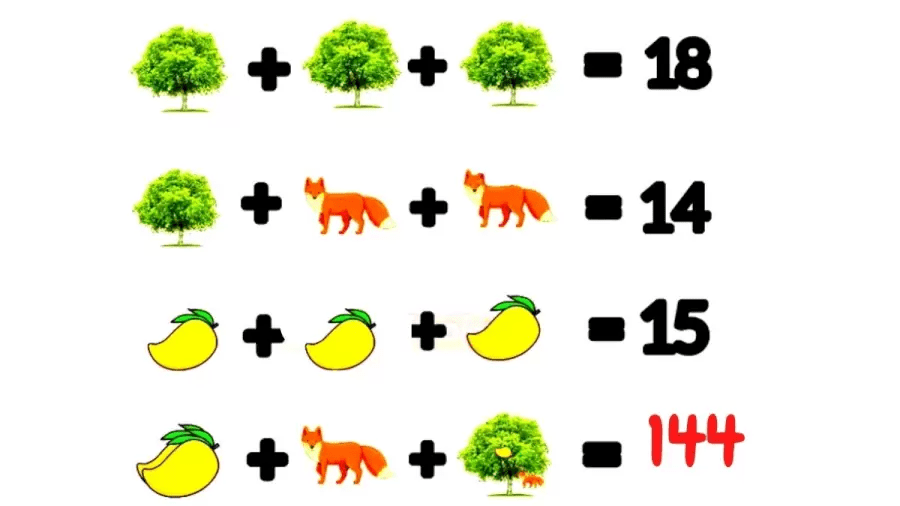 As you can see, the solution is as follows: the tree is 6, the fox is 4, and the mango is 5, so the total for the final equation is 144. Especially if you look closely. Did you get it right?